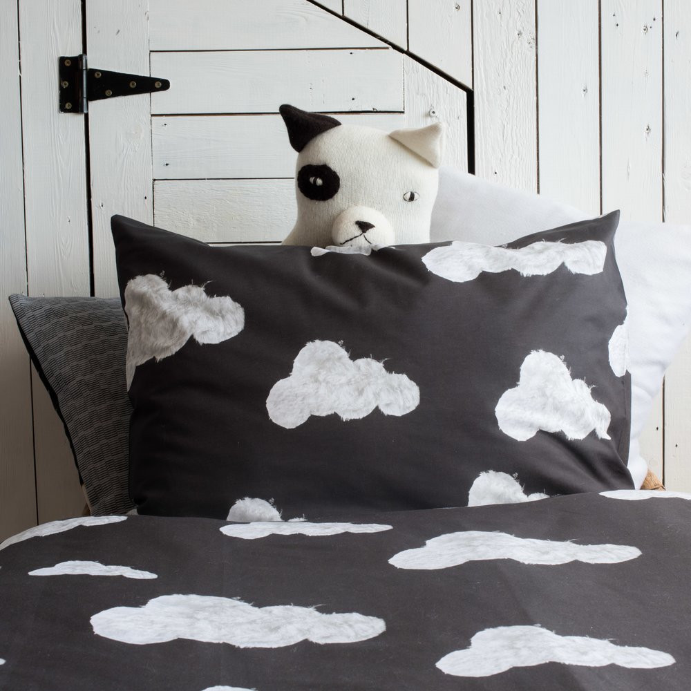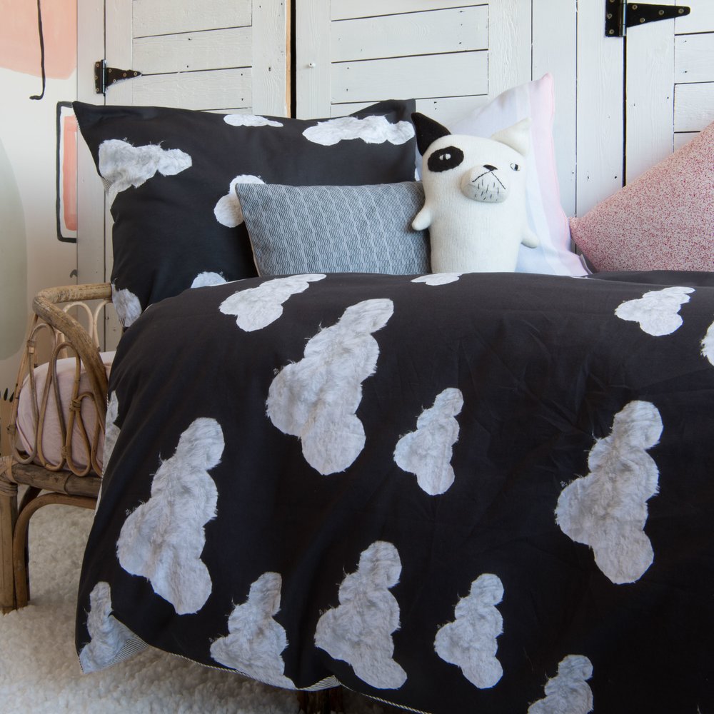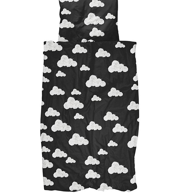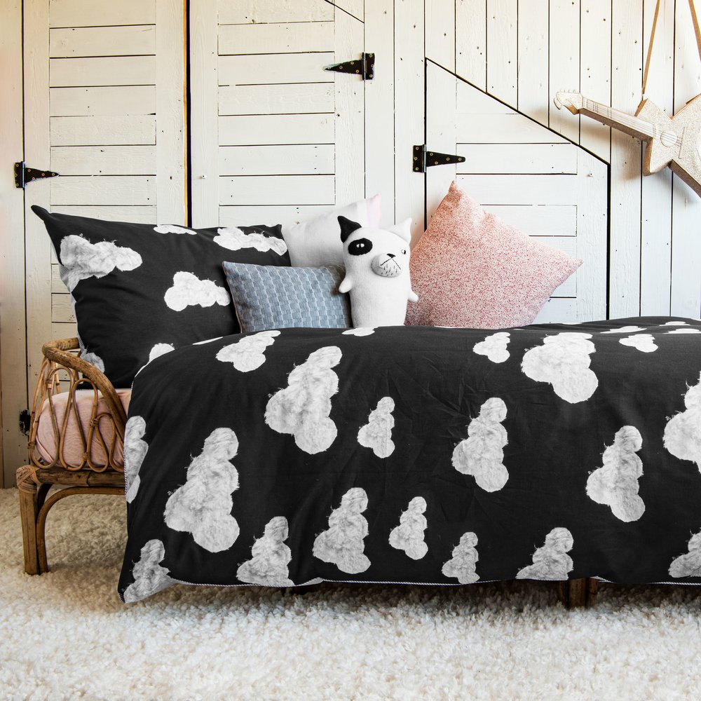 Dizajnové čierne posteľné obliečky s potlačou oblakov. Úžasné však?