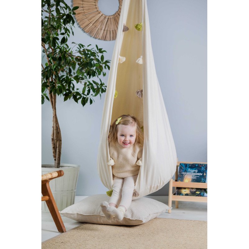 Po zavesení sa tento krásny hojdací vak rýchlo stane atrakciou miestnosti a zo skúsenosti našich malých používateľou sme sa dozvedeli, na koľko spôsobov hojdací vak používajú. Je nádherným kútikom na čítanie kníh. Hojdací vak môžeme zavesiť aj na balkón, terasu alebo dokonca aj na konár.