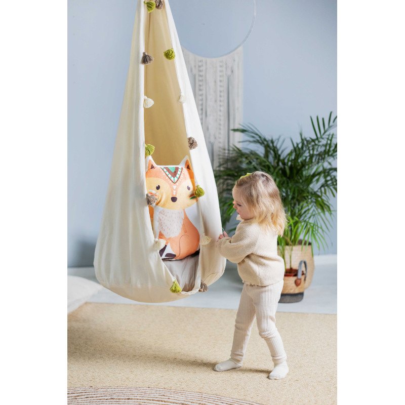 • Hojdací vak je vyrobený zo 100% mäkkej, certifikovanej bavlnenej látky ušitej v dvoch vrstvách, vďaka čomu je stabilný a bezpečný. Vankúš je vyplnený antialergickým silikónovým páperím a má snímateľný poťah na zips - nemusíte tak prať celý vankúš.