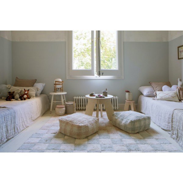 Štýlový koberec Lorena Canals. Je vyrobený z bavlny so vzorom šachovnice či kuchynských dlaždíc. Koberec od značky Lorena Canals vytvára dojem štvorcového usporiadania s tmavšími a svetlejšími odtieňmi, čím vytvára geometrický a pravidelný vzor.