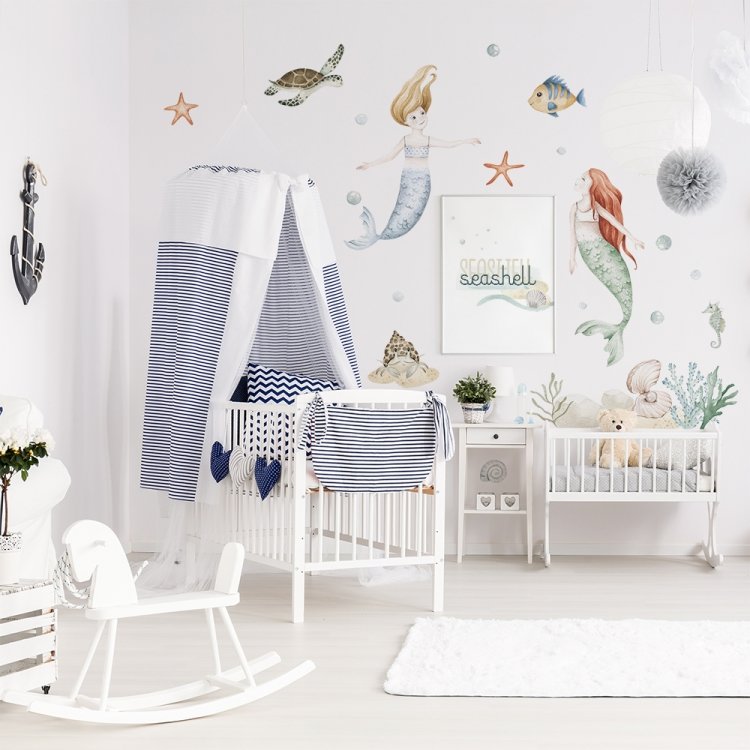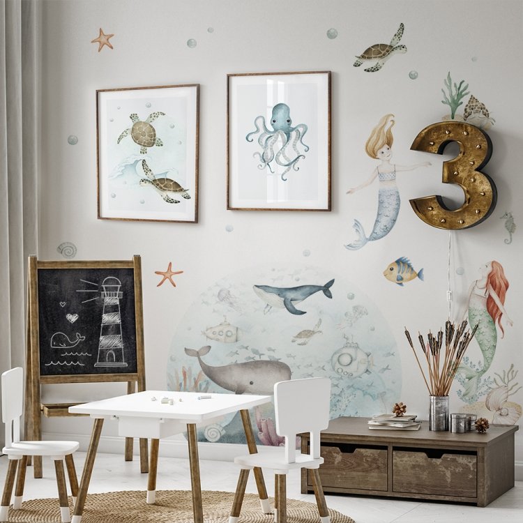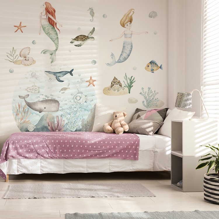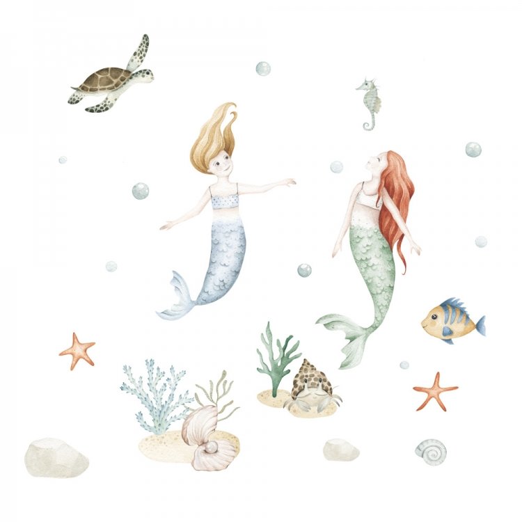 Nálepka je vytlačená na matnej fólií. Nálepku tvoria morské panny, ryby, korytnačku, hviezdicu, rastliny, kamene a bubliny. Nálepka môže zdobiť nie len steny, ale aj nábytok a okná a vytvoriť tak jedinečný dizajn detskej izbičky.