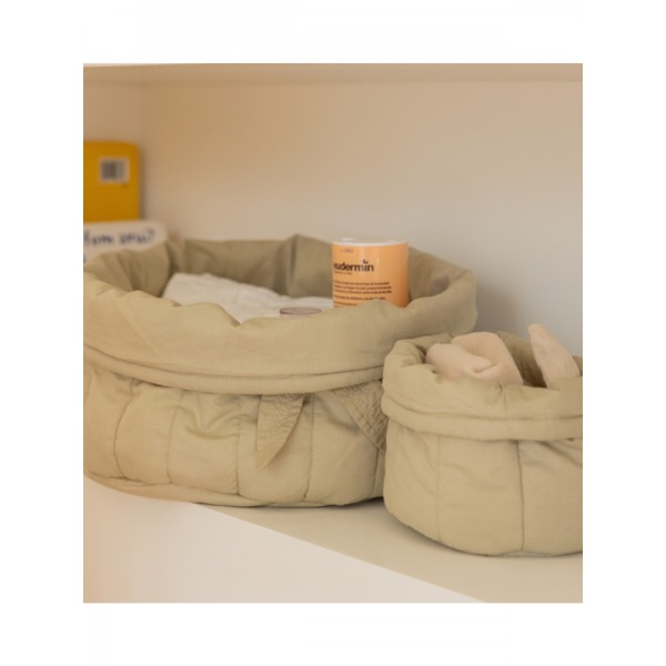 Táto praktická súprava dvoch mäkkých košíkov, vyrobené z mäkkej organickej bavlny. Ideálna voľba ak chcete mať všetko po ruke pri bábätkách, môžu slúžiť aj ako uložný priestor nas hračky. Veľký košík zdobí bambusový list.