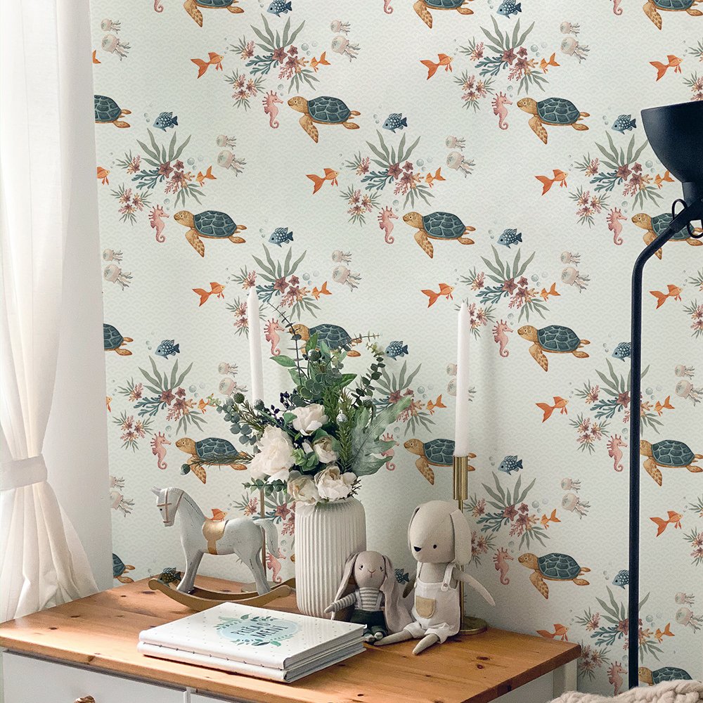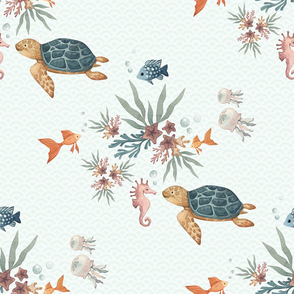Úžasná tapeta do detskej izby. Vinylová tapeta na vliesovom podklade s motívom korytnačiek, korálov a oceánu je vytlačená na kvalitnom umývateľnom materiáli s gramážou 350g/m2.