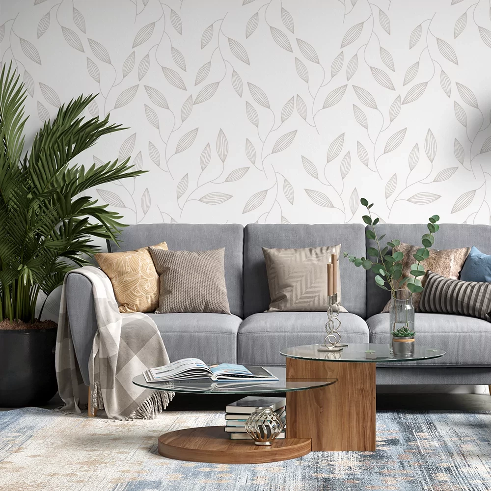 Táto očarujúca tapeta je zasadená do sveta jemných listov, ktoré akoby tancovali po stene. Listy majú jemný odtieň.