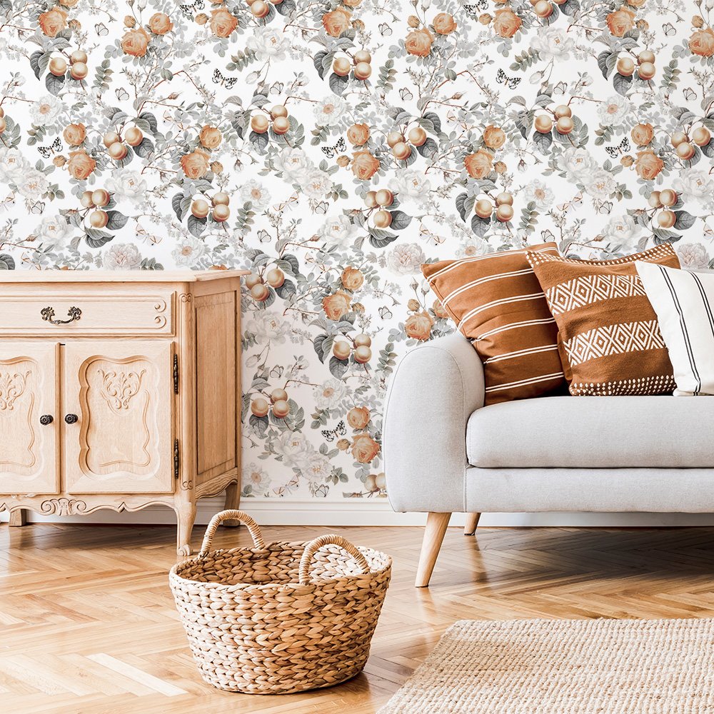 Nádherná tapeta s motívom kvetov a broskýň bude vyzerať skvelo v takmer každej miestnosti. Unikátny vzor tapety dodá jedinečný dizajn vašej obývačke alebo spálni. Ako krásna romatická a nezvyčajná dekorácia bude úžasne dotvárať štýl detskej izby, zároveň bude skvelým darčekom pre všetkých milovníkov kvetov a krásnych interiérov. :)